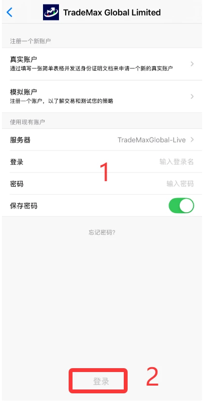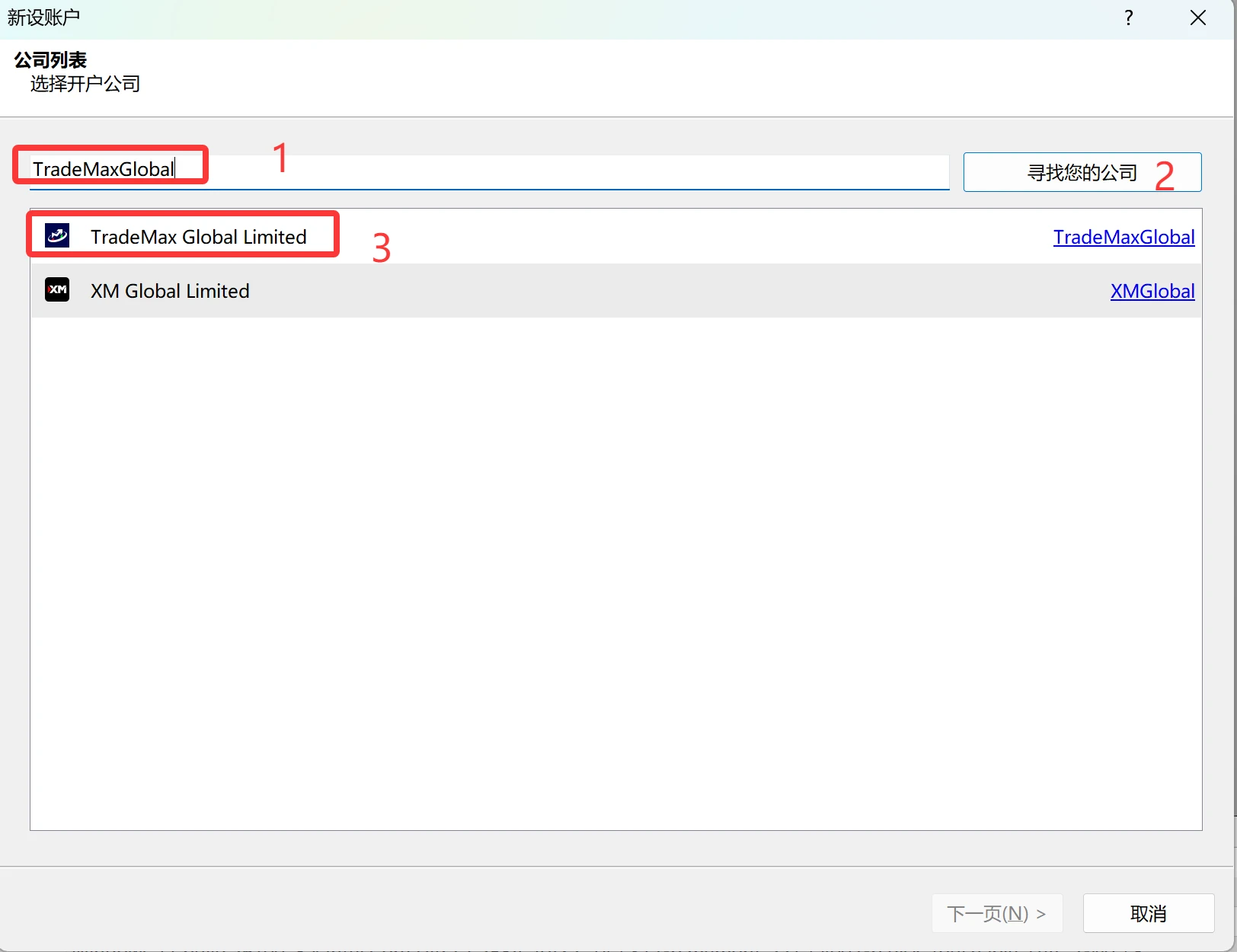 2.在“服务器”栏中,选择“TMGM集团”对应的服务器名称(例如:TradeMaxGlobal)。然后选择“TradeMax Global LMITED”