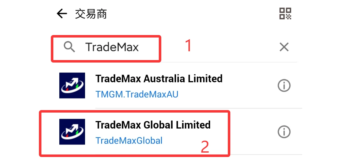 4.在上方输入服务器“TradeMaxGlobal”,并选择“TradeMax Global LMITED”